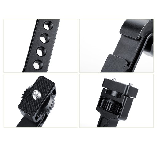 Uchwyt posiada 4x mocowanie żeńskie z gwintem 1/4" oraz 1x zimną stopkę typu ISO. Mocowania te pozwalają na mocowanie licznych akcesoriów dodatkowych z segmentu foto / audio / video.