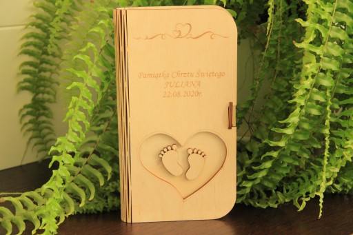 Drewniane pudełko na pieniądze to prezent, który zaskoczy obdarowanego, gdyż jest to oryginalny sposób na podarowanie pieniędzy, dzięki któremu Twój datek nie zostanie zapomniany. W opakowaniu prócz banknotów można umieścić również kartkę z życzeniami. Pudełeczko wykonane jest z drewna metodą cięcia laserowego z dekoracyjnymi elementami. Idealne jako pamiątka Komunii Świętej, Chrztu, Bierzmowania, urodzin czy ślubu. Opakowanie można dekorować wybraną metodą.