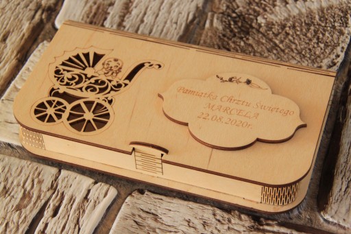 Drewniane pudełko na pieniądze to prezent, który zaskoczy obdarowanego, gdyż jest to oryginalny sposób na podarowanie pieniędzy, dzięki któremu Twój datek nie zostanie zapomniany. W opakowaniu prócz banknotów można umieścić również kartkę z życzeniami. Pudełeczko wykonane jest z drewna metodą cięcia laserowego z dekoracyjnymi elementami. Idealne jako pamiątka Komunii Świętej, Chrztu, Bierzmowania, urodzin czy ślubu. Opakowanie można dekorować wybraną metodą.