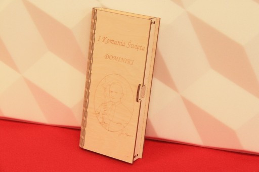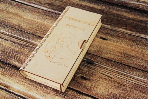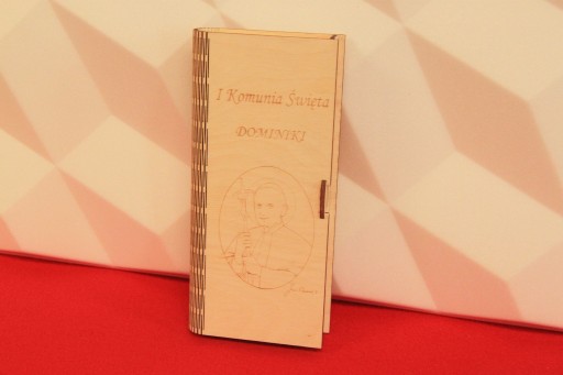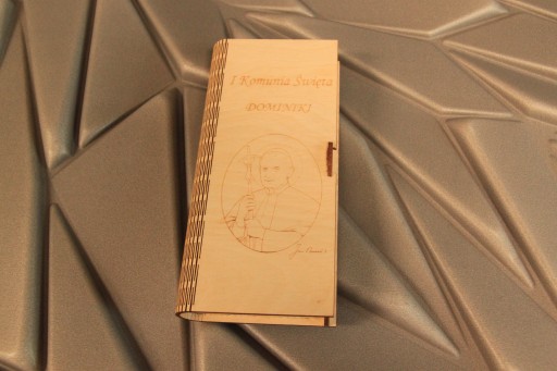 Drewniane pudełko z wizerunkiem Papieża, w którym można przekazać pieniądze, kartkę z życzeniami lub inny drobny prezent. Opakowanie wykonane z drewna metodą cięcia laserowego z grawerowanymi elementami dekoracyjnymi to wyjątkowa pamiątka Komunii Świętej, Chrztu lub Bierzmowania. Można ją pozostawić z oryginalnej wersji lub dowolnie dekorować wybraną metodą.