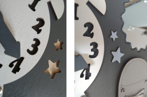 Elementy ozdobne jak gwiazdki, oraz cyferki, wklejamy we frezowane gniazda (pokazane na zdjęciu). Taki sposób zapewnia trwałość mocowania. Elementy przyklejone bezpośrednio do tablicy, bez takiego przygotowania, bardzo łatwo można oderwać lub odpadają one samoistnie.