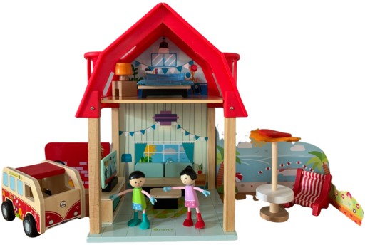 Drewniany domek plażowy z akcesoriami zapewni wiele godzin wspaniałej zabawy. Dziecko odgrywa różne role, samodzielnie lub wspólnie z przyjaciółmi. Zabawka rozwija zainteresowania związane z projektowaniem i wyobraźnię przestrzenną, a także doskonali umiejętności manualne. Domek z kolorowym wnętrzem i bogatym wyposażeniem to spełnienie marzeń małych projektantów. Drewniane mebelki można ustawiać według własnego pomysłu i wciąż na nowo cieszyć się zabawą.