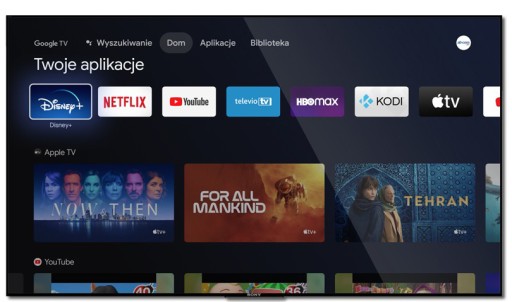 Zawiera Google Voice Assistant, preinstalowany YouTube, certyfikat Netflix, Google Play Store, Prime Video, wbudowany Chromecast.