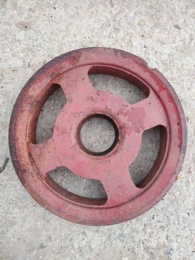 Żeliwne koło pasowe na cztery paski 13 mm. Koło cztero ramienne, na jednym z ramion pęknięcie widoczne na zdjęciu. Nadaje się na ozdobę lub po przerobieniu , za spawaniu do użytku .