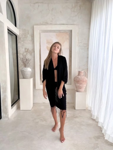 Kolejna czarna narzutka z frędzlami, którą pokochacie podczas ciepłych, letnich dni. Jest wykonana z przewiewnego materiału, który ochroni Was przed słońcem dając jednocześnie uczucie komfortu.