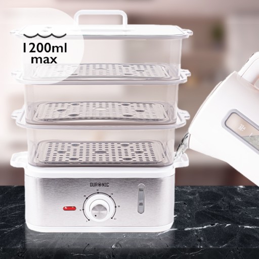 - Duronic FP87 to elektryczny parowar dla fanów zdrowego odżywiania i wygody w kuchni. Za jednym razem możesz przygotować aż 3 dania dzięki wykorzystaniu trzech poziomów parowaru. Wykorzystanie wszystkich poziomów parowarów daje ci możliwość wykonania wszystkich składników na rodzinny obiad przy jednym użyciu.