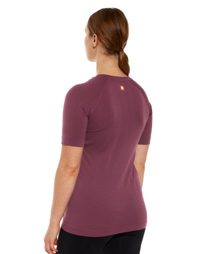 Ta sportowa koszulka z krótkim rękawem przylega do ciała, dopasowując się do kształtu sylwetki, a bezszwowa konstrukcja zapobiega powstawaniu nieprzyjemnych otarć i podrażnień.