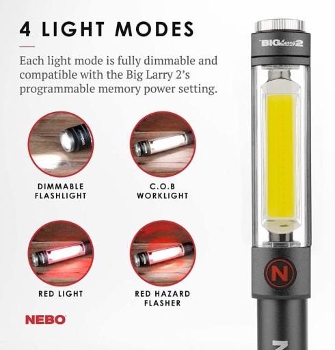 Latarka Big Larry2 w kolorze czarnym, amerykańskiej firmy NEBO®, osiąga moc 500 lumenów w technologii COB LED. Posiada 4 tryby światła (wysokie, robocze, czerwone, migające awaryjne). Produkt jest wodoodporny, wykonany z anodowanego aluminium lotniczego, posiada magnetyczną podstawę.