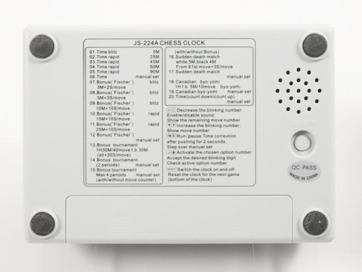 Przedstawiamy profesjonalny zegar szachowy JS-224A. Urządzenie jest starannie wykonane, wyposażone w duży wyświetlacz. Produkt ten jest wykorzystywany nie tylko podczas wszelkiego rodzaju międzynarodowych turniejów szachowych, ale także innych gier jak np. scrabble, warcaby. Zegar wykorzystuje układ scalony japońskiej firmy EPSON, który jest łatwy w obsłudze, wykonuje dokładne obliczenia i jest odporny na zakłócenia.