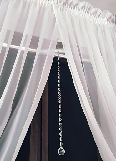 Zawieszka posiada na górze haczyk umożliwiający prosty montaż na każdym rodzaju karnisza (można ją zawiesić na kółku, złapać żabką lub agrafką) a także bezpośrednio na firance lub zasłonce.