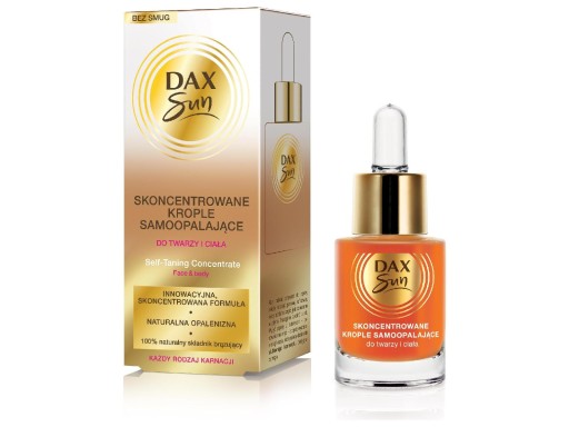 Skoncentrowane krople samoopalające do twarzy i ciała od marki Dax Sun.