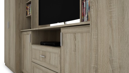 ⏺ Meblościanka składa się z oddzielnych segmentów tworzących razem kompletny zestaw pokojowy. W razie potrzeby segmenty (nie wszystkie) mogą stać jednak oddzielnie!
