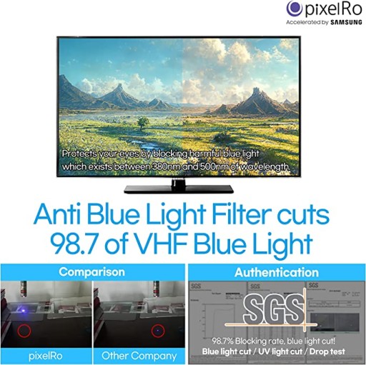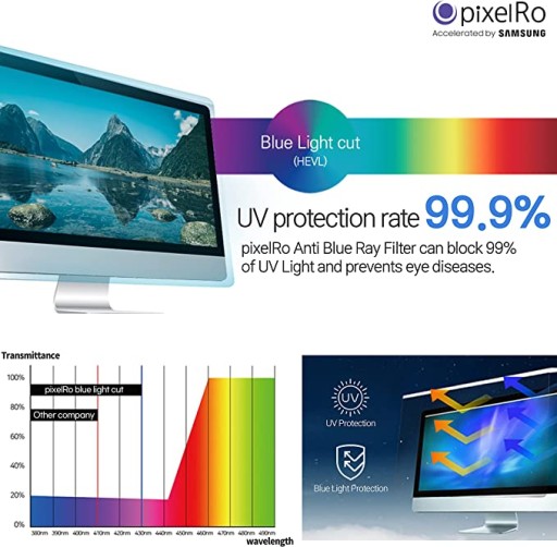 Filtr anty-niebieski Pixelro może wyłączyć 98,7% szkodliwego niebieskiego światła, które istnieje między 380 nm a 420 nm długości fali.