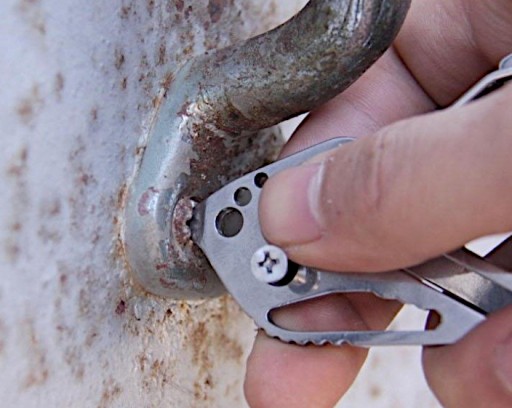 Nierdzewny karabińczyk do kluczy wykonany został z ze stali nierdzewnej wycinanej laserowo. Całość połączona została śrubami ze stali nierdzewnej i zaopatrzona w również nierdzewny mocny zatrzask.