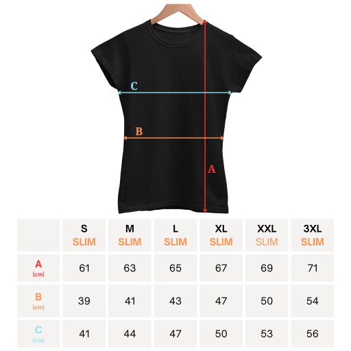 Oferujemy damskie koszulki w dopasowanym kroju slim, co może sprawić, że są one węższe niż inne produkty dostępne na rynku odzieżowym. Polecamy dokładne zweryfikowanie rozmiarów koszulki, którą chcą Państwo zamówić, idealnie poprzez zmierzenie ulubionej koszulki i porównanie jej wymiarów z naszą tabelą rozmiarową. To szczególnie ważne, gdy koszulka ma być prezentem dla kogoś, o czyim rozmiarze nie mamy pewności.