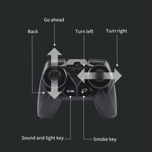 Funkcja: do przodu, do tyłu, skręć w lewo, skręć w prawo, efekty dźwiękowe dymu, 2,4 GHz, 6 kanałów.