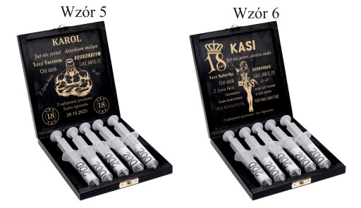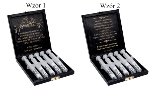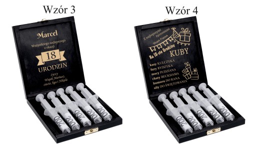 Wychodząc naprzeciw Państwa oczekiwaniom stworzyliśmy piękne pudełko z nadrukiem i grawerem na pieniądze. Ekologiczne materiały i piękny drukowany motyw nadają klimatu i charakteru. Do strzykawek włożymy swobodnie banknoty, a wygrawerowane życzenia na wewnętrznej stronie zastąpią klasyczną kartkę. Taki prezent z pewnością zaskoczy każdego. Naszym kuferkiem mogą Państwo zastąpić nudne plastikowe lub tekturowe opakowania. Skrzynka z Państwa indywidualną dedykacją i życzeniami, będzie stanowić niezapomnianą pamiątkę na długie lata.