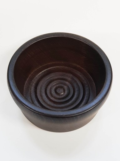 Wysokość spiralnej miski z brodą i jej spłaszczenie, daje wspaniałe uczucie dopasowania i jest wygodna do trzymania. Średnica dna mierzy 12 cm. Ponieważ te miski do brody są wykonywane całkowicie ręcznie, a także ze względu na nieodłączną naturę drewna, każdy kawałek różni się od następnego wyglądem, z żyłami od czarnego do złotego. Ręczne obracanie na dnie jest wykonywane w celu znacznego zwiększenia dopływu powietrza do mydła podczas montażu, co sprzyja wytwarzaniu bogatej i pełnej piany. To również, będąc wykonywane ręcznie na drewnie z kontr-sękami, może prezentować lekko "brudne" zwisy.