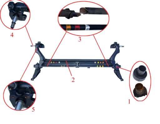 - Drążki skrętne (3) są specjalnie selekcjonowane i sprawdzane pod kątem przydatności do dalszej eksploatacji, są to drążki oryginalne używane objęte 2-letnią gwar. tak jak cała belka. Do naprawy nie stosujemy nowych drążków, zamienników ze względu na ich słaba trwałość (ulegają szybkiemu odkształcaniu), z kolei nowe, oryginalne są drogie, w związku z tym przyjęte przez nas rozwiązanie co do stosowanych do naprawy drążków skrętnych pozwala wykonać ją w rozsądnych kosztach jednocześnie wziąć za nią odpowiedzialność przez 2 lata gwar.
