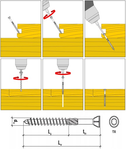 - Karby tnące - Specjalne karby tnące na gwincie przecinają włókna struktury drewna podczas wkręcania
