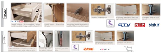 Podnośniki BLUM - ciche oraz delikatne otwieranie, dodatkowo posiada regulację siły.Zawiasy ze spowalniaczem dodatkowo regulowana zawieszka do szafek górnych, idealna do szyny montażowej.