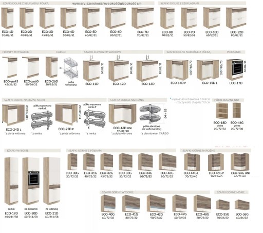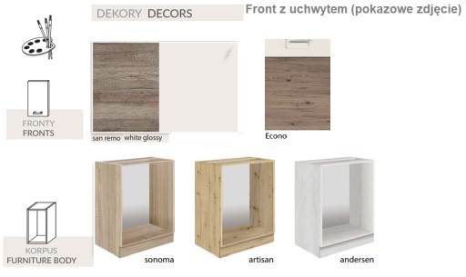 Korpusy szafek dolnych wykonane z płyty wiórowej laminowanej w kolorze sonoma, artisan lub andersen. Głębokość korpusów szafek stojących - 51 cm. Nóżki regulowane 10 cm (z płynną regulacją wysokości).
