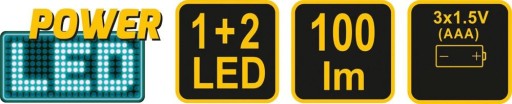 Źródło światła stanowi dioda POWER LED o mocy 1W i strumieniu świetlnym 100lm. Lampa posiada dodatkowo dwie boczne, czerwone diody LED zapewniające delikatne oświetlenie, pozbawione efektu olśnienia przy minimalnym poborze mocy z baterii.