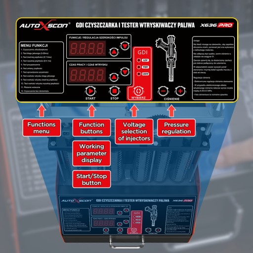 W związku z rosnącą dojrzałością i wykorzystaniem bezpośredniego wtrysku benzyny, AUTOXSCAN wypuścił w 2023 r. urządzenie do czyszczenia i testowania wtryskiwaczy X636Pro GDI. Bezpośredni wtrysk benzyny to technologia, która wtryskuje paliwo bezpośrednio do cylindra i miesza je z powietrzem dolotowym. W porównaniu z konwencjonalnymi wtryskiwaczami, zastosowanie GDI może pomóc poprawić wydajność silnika i właściwą moc wyjściową, a także zmniejszyć emisję spalin. X636Pro obsługuje nie tylko GDI, EFI, FSI i inne typy wtryskiwaczy paliwa, ale także jest kompatybilny ze standardowymi wtryskiwaczami paliwa. X636Pro jest dostępny w trzech napięciach do zasilania wtryskiwaczy GDI, 12 V, 70 V i 120 V, co w zasadzie obejmuje wtryskiwacze większości marek pojazdów w Europie, Ameryce i Azji.