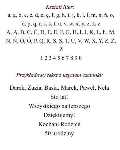 Szerokość napisu: 19 cm, szerokość mierzona od lewej strony do prawej dla najszerszego wersu. Oznacza to, że każdy inny jest proporcjonalnie krótszy. Zachowujemy w ten sposób tą samą wielkość liter dla każdego wersu