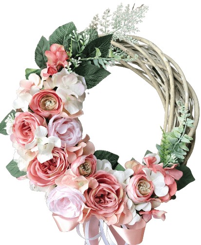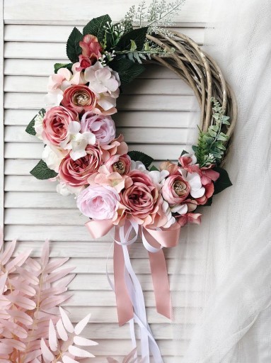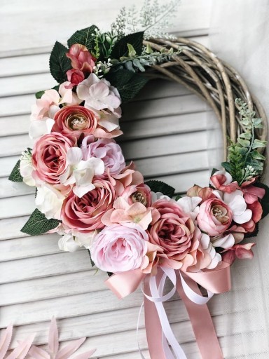 Uroczy, romantyczny wianek, ozdobiony sztucznymi kwiatami róż, pełników, hortensji oraz różnorodnymi dodatkami, liśćmi i kokardką.