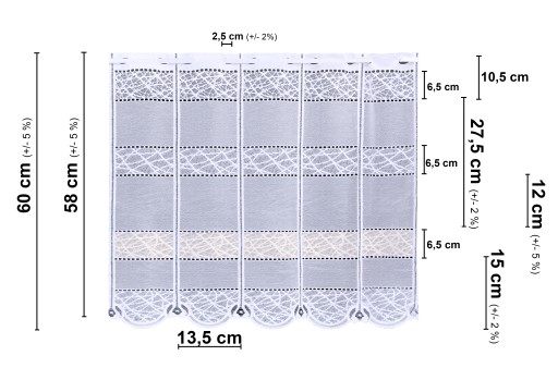 Tkanina firanowa na metry typu lambrekin, z subtelnym delikatnym segmentowym wzorem. Lambrekiny to krótkie firanki zawieszane jako ozdoba w dolnej lub w górnej części okna, chroniące przed światłem oraz ciekawskimi sąsiadami, dyskretnie oddzielają strefę intymną domu, ale jednocześnie nie zabierają naturalnego światła.