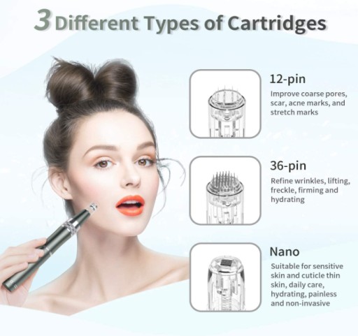 3 sztuk pojedynczo zapakowanych nabojów: Zestaw mikroigieł jest dostarczany z 3 pojedynczo zapieczętowanymi jednorazowymi wkładami igłowymi dla optymalnego bezpieczeństwa i komfortu. Jest bardzo higieniczny i praktyczny, wystarczy wymienić wkład po każdym użyciu. W zestawie 1 x 36 pinów, 1 x 12 pinów, 1 x nano-round mikroigły można zmieniać wkłady w zależności od zabiegu.