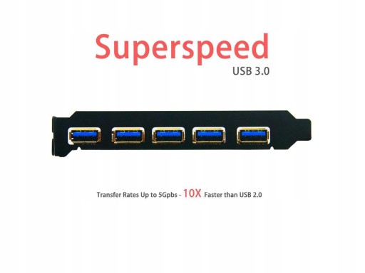 Kompatybilny z USB 2.0 i 1.1. Szybkość transferu danych do 5.0G bps - 10x szybciej niż USB 2.0, 5 zewnętrznych złączy żeńskich USB 3.0 typu A. Jedno złącze męskie 20P płyty głównej dostępne dla 2 dodatkowych portów USB 3.0.