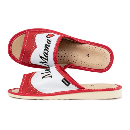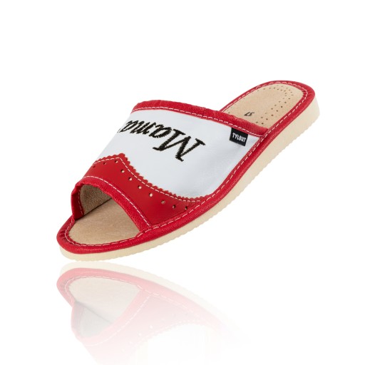 - Damskie pantofle wykonane wyłącznie z wysokiej jakości naturalnych materiałów, są super miękkie i wygodne. Skórzany wierzch oraz wkładka przyjemnie okryje stopy Twojej Mamy przez cały dzień. Model ten zdobiony jest delikatnym haftem z napisem "MAMA" oraz czerwonym serduszkiem