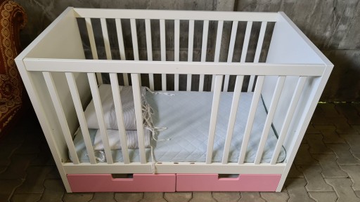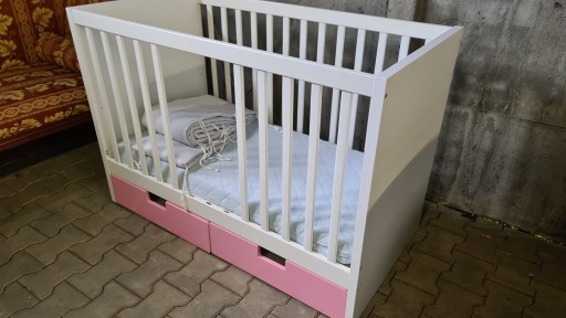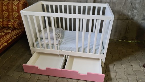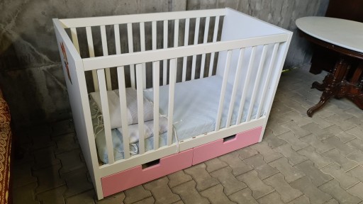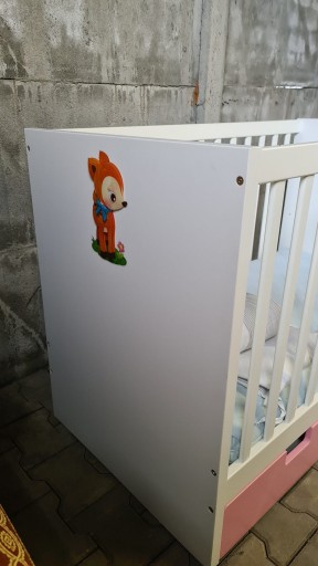 Wycięte trzy szczebelki. Można odwrócić w stronę ściany i przełożyć szuflady.