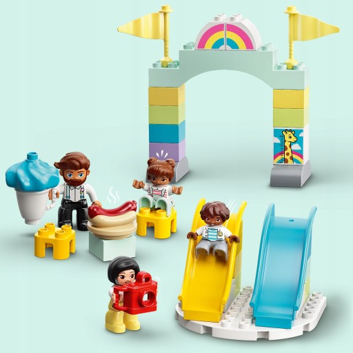 • W komplecie siedem postaci DUPLO® — dwie kobiety, mężczyzna i czworo dzieci — a także dwie zjeżdżalnie, mechaniczna karuzela, obracający się diabelski młyn z trzema kolorowymi wagonikami, popychany pociąg i mnóstwo ciekawych dodatków.