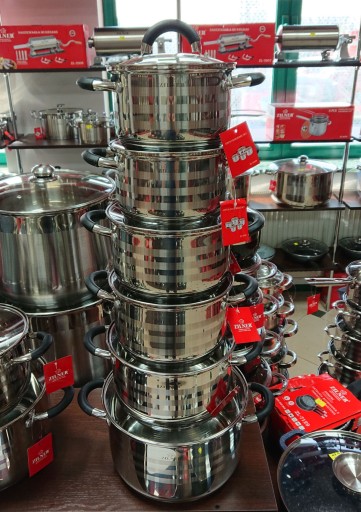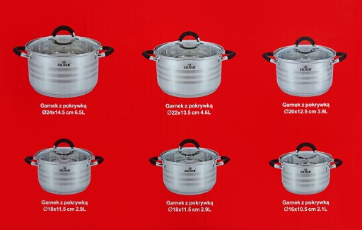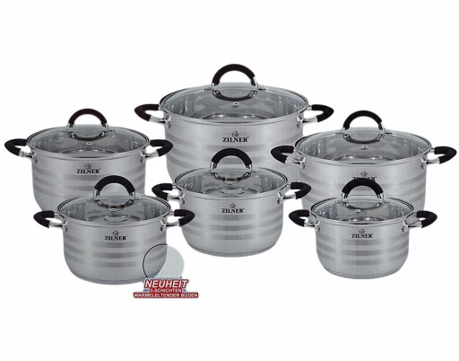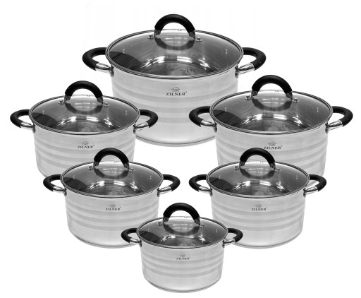 12 częściowy komplet garnków firmy ZILNER wykonany ze stali nierdzewnej. Stal chromowo-niklowa z której wykonany jest cały komplet jest nierdzewna, wytrzymała i długowieczna. Zastosowany materiał jest nie tyko najlepszy z możliwych, ale także świetnie się prezentuje i jest wyjątkowo łatwy w czyszczeniu oraz posiada właściwości bakteriobójcze. Naczynia w komplecie są z zewnątrz satynowe (posiadaja błyszczące paski) oraz błyszczące wewnątrz. Ferromagnetyczne 5-warstwowe dno akutermiczne (5mm) z warstwą aluminiową gwarantuje doskonały rozdział i magazynowanie ciepła. Wszystkie garnki z kompletu można używać na wszystkich rodzajach kuchenek, również na kuchni indukcyjnej. Nitowane uchwyty (polerowane) z okładzinami silikonowymi. Na wewnętrznej stronie każdego garnka znajduje się praktyczna miarka. Przyzwoite, umiarkowanie ciężkie garnki działające na indukcji, za bardzo atrakcyjną cenę.