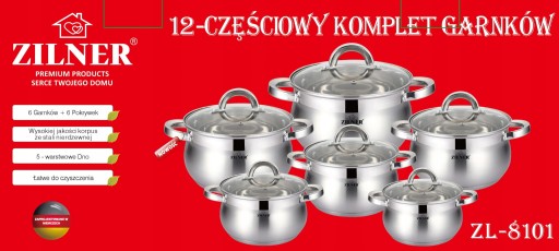 12 częściowy komplet garnków firmy ZILNER wykonany ze stali nierdzewnej. Stal chromowo-niklowa z której wykonany jest cały komplet jest nierdzewna, wytrzymała i długowieczna. Zastosowany materiał jest nie tyko najlepszy z możliwych, ale także świetnie się prezentuje i jest wyjątkowo łatwy w czyszczeniu oraz posiada właściwości bakteriobójcze. Naczynia w komplecie są z zewnątrz delikatnie matowane do ok. 3/4 wysokości (INOX) oraz błyszczące wewnątrz. Ferromagnetyczne 5-warstwowe dno akutermiczne (5mm) z warstwą aluminiową gwarantuje doskonały rozdział i magazynowanie ciepła. Wszystkie garnki z kompletu można używać na wszystkich rodzajach kuchenek, również na kuchni indukcyjnej. Nitowane uchwyty (polerowane). Na wewnętrznej stronie każdego garnka znajduje się praktyczna miarka. Przyzwoite, umiarkowanie ciężkie garnki działające na indukcji, za bardzo atrakcyjną cenę.