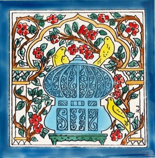 PRZEPIĘKNA ORYGINALNA ARABSKA KAFLA, RĘCZNIE MALOWANA, Z ORIENTALNYM MOTYWEM ARABSKIM - KLATKĄ DLA PTAKÓW. BAJECZNE APLIKACJE.