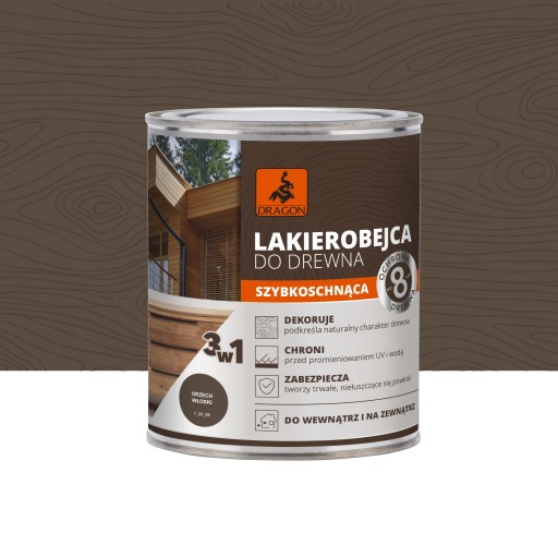 Szybkoschnąca Lakierobejca Dragon to wysokiej jakości produkt ochronno – dekoracyjny do zabezpieczenia drewna zarówno wewnątrz pomieszczeń jak i na zewnątrz. Dzięki zaawansowanej formule 3 w 1 idealnie sprawdzi się jako produkt, który impregnuje drewno, nadaje kolor i chroni na lata.