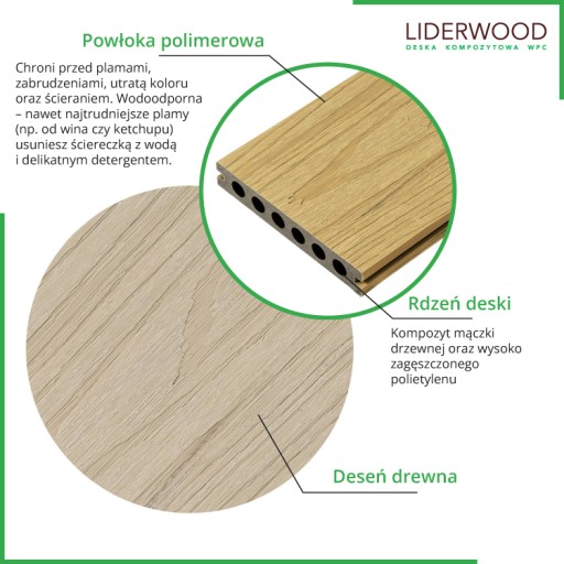 Deska Kompozytowa nowej generacji Premium to produkt wysokiej jakości. Dzięki nowoczesnej technologii produkcji deska ma charakterystyczną strukturę naturalnego usłojenia desek. Deseń drewna jest wytłaczany na powierzchni za pomocą pras w wysokich temperaturach z nałożoną zewnętrzną powłoką polimerową, która otacza deskę ze wszystkich stron i chroni ją przed plamami oraz utratą koloru. Dzięki tej metodzie produkcji jest też trwała i odporna na ścieranie. Druga strona jest w innym kolorze przez co deskę możemy stosować na dwie strony w zależności od preferencji. Dodatkowo konstrukcja wewnętrzna deski jest dużo sztywniejsza i bardziej wytrzymała na uszkodzenia mechaniczne przez zastosowanie specjalnego przekroju okrągłych komór i dużej gęstości kompozytu.