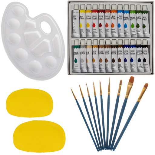 W zestawie jest 24 kolorów farb akwarelowych w metalowych tubkach. Przeznaczone do lekkich, zwiewnych obrazków, pejzaży czy portretów malowanych na papierze.