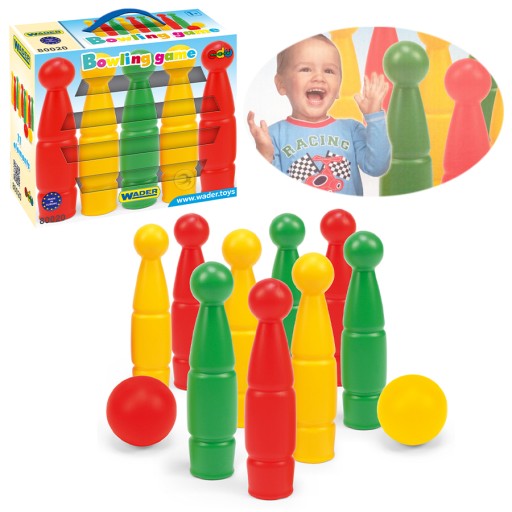 - komplet zawiera 9 różnokolorowych kręgli i 2 piłeczki