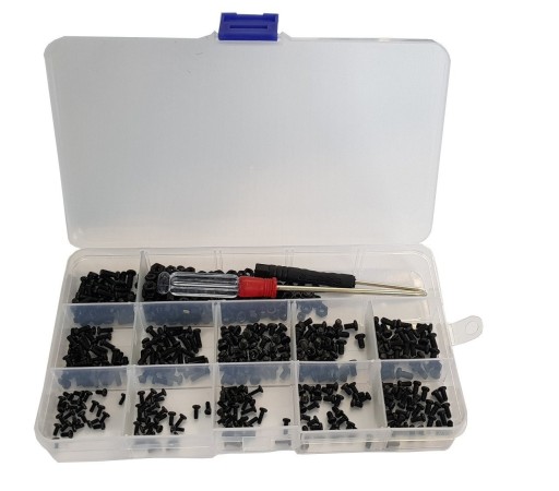 Zestaw czarnych śrub oraz nakrętek M2, M2.5 oraz M3 różnej długości. Do zestawu dołączony jest również śrubokręt.