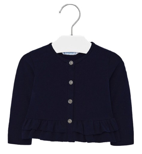 Wdzianko z długim rękawem dla dziewczynki. Okrągły dekolt. Zapinane z przodu na guziczki. Dół wykończony podwójna falbanką. Długość do bioder. Elastyczna, rozciągliwa i przyjemna w dotyku dzianina. Kolor : granatowy