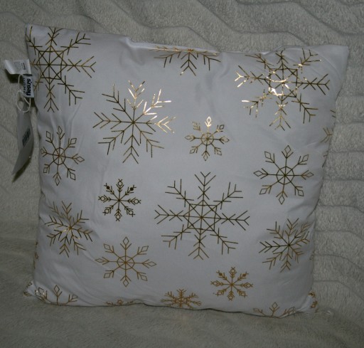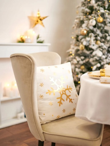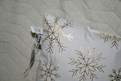 Piękne białe poduszki ze złotymi motywami śnieżynek to idealny komplet dekoracyjny na święta Bożego Narodzenia.