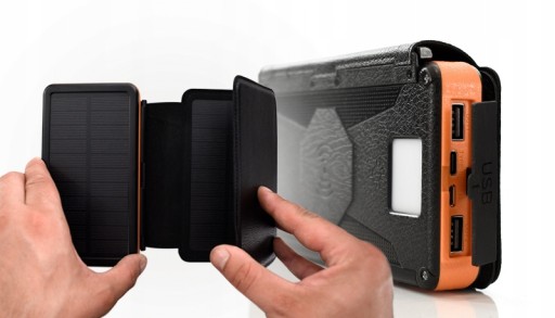 Dodatkowo wyposażony jest w w potrójny, rozkładany panel słoneczny o łącznej mocy 1.8W, dwa wyjścia USB, wejście USB-C oraz ŁADOWARKĘ INDUKCYNĄ.