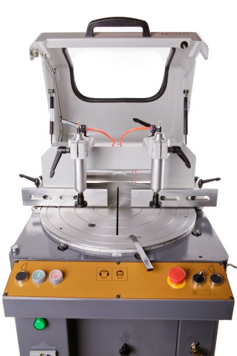 - Półautomatyczna pilarka tarczowa sterowana pneumatycznie to stalowa tarcza obracana silnikiem elektrycznym za pomocą paska, na którego krawędzi znajdują się zęby tnące. Ruch tarczy tnącej odbywa się za pomocą napędu pneumatycznego od dołu do góry.