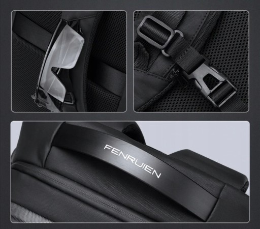 Dwukomorowy plecak marki FRN o symbolu 7386 typu kapsuła o nowoczesnym wyglądzie został wykonany z nieprzemakalnych i odpornych na ścieranie materiałów – oxford i ABS, dzięki czemu jest trwały i wodoodporny. Dodatkowe zabezpieczenie dla przenoszonych rzeczy stanowi usztywniany przód plecaka, który został wykonany z tworzywa PC w futurystycznym kształcie wielościanu. Główna komora plecaka, która otwiera się pod kątem 45 st., a po odpięciu nap zabezpieczających można otworzyć ją jak walizkę, pod kątem 180 stopni. W części przeznaczonej na zapakowanie ubrań znajdują się trzy kieszonki na akcesoria. Przestrzeń na ubrania jest oddzielona siatkową przegrodą zapinaną na zamek. W pozostałej części głównej komory zaprojektowano organizer na akcesoria i długopisy, siatkową kieszeń na drobiazgi zapinaną na zamek oraz przypinkę do kluczy. W drugiej komorze z tyłu plecaka znajduje się kieszeń na laptopa w rozmiarze do 17,3” zapinana na rzep oraz pięć kieszonek na akcesoria. Tą komorę również można otworzyć na płasko, jak walizkę, aby ułatwić dostęp do zawartości. Obie komory plecaka są zabezpieczone antykradzieżowym zamkiem TSA Lock, a ich zamki są dodatkowo zabezpieczone przed przemakaniem. Po bokach plecaka znajdują się zapinane na zamek, elastyczne kieszenie przeznaczone na napój lub parasolkę. Natomiast z lewej strony plecaka umieszczono zamykane, zewnętrzne złącze USB, dzięki któremu nie ma konieczności wyciągania power banka z plecaka, aby naładować telefon lub inne przenośne urządzenie. Tył plecaka i szelki wyprofilowane w kształcie litery „S” wyłożono miękkimi gąbkami, dzięki czemu plecak jest wygodny w noszeniu. Na jednej z szelek umieszczono zapinaną na zamek małą kieszonkę np. na kartę lub identyfikator oraz pasek do zahaczenia okularów. Plecak posiada pas piersiowy, aby lepiej rozłożyć ciężar przy maksymalnym zapakowaniu. Na plecach znajduje się nylonowy pas, dzięki któremu można założyć plecak na rączkę torby lotniczej oraz kieszeń zapinana na zamek, w której można bezpiecznie przechować telefon lub portfel. U góry plecaka umieszczono wygodny uchwyt do przenoszenia w ręce z logo producenta. Plecak FRN 7368 polecamy osobom, które szukają bezpiecznego i funkcjonalnego plecaka na laptopa o nietuzinkowym designie.
