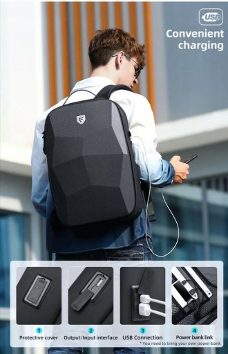 Plecak wyposażony jest w gniazdo usb, dzięki czemu nie ma konieczności wyciągania power banka z plecaka, aby naładować telefon. Uwaga, power bank nie jest częścią zestawu.